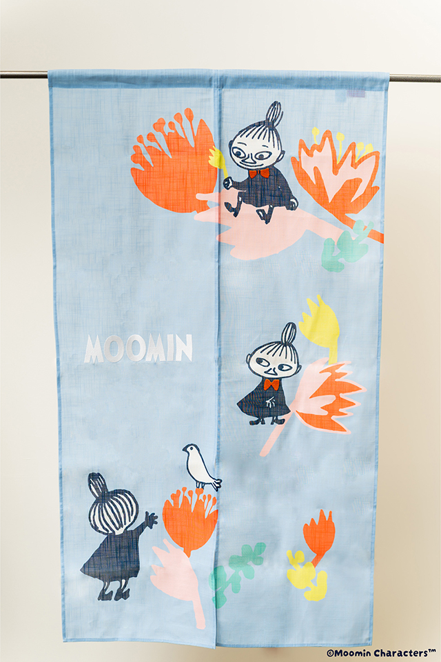 リトルミイフェアのアートがデザインされたのれん。MOOMINのロゴやリトルミイのリボンが刺繍になっていて、室内にさりげないアクセントを添えます。